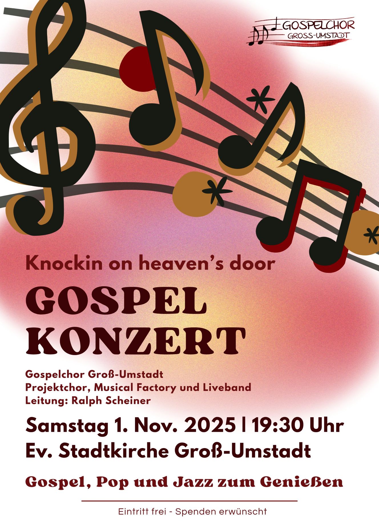 Wir begleiten unsere Freunde des Gospelchors Groß-Umstadt am 1. November 2025 um 19.30 Uhr bei ihrem Gospel-Konzert unter dem Motto „Knockin‘ on heaven’s door“ in der ev. Stadtkirche in Groß-Umstadt. Freut euch auf